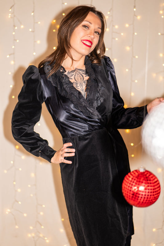 maison d' ellas haute couture vintage 60s velvet satin wrap dress with lace collar